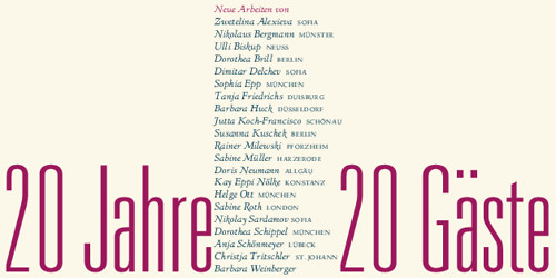Zwetelina Alexieva SOFIA Nikolaus Bergmann MÜNSTER Ulli Biskup NEUSS Dorothea Brill BERLIN Dimitar Delchey SOFIA Sophia Epp MÜNCHEN Tanja Friedrichs DUISBURG Barbara Huck DÜSSELDORF Jutta Koch-Francisco SCHÖNAU Susanna Kuschek BERLIN Rainer Milewski PFORZHEIM Sabine Müller HARZGERODE Doris Neumann SONTHOFEN K.E. Nölke KONSTANZ Werner Reister BAITZ Sabine Roth LONDON Nikolay Sardamov SOFIA Dorothea Schippel MÜNCHEN Anja Schönmeyer LÜBECK